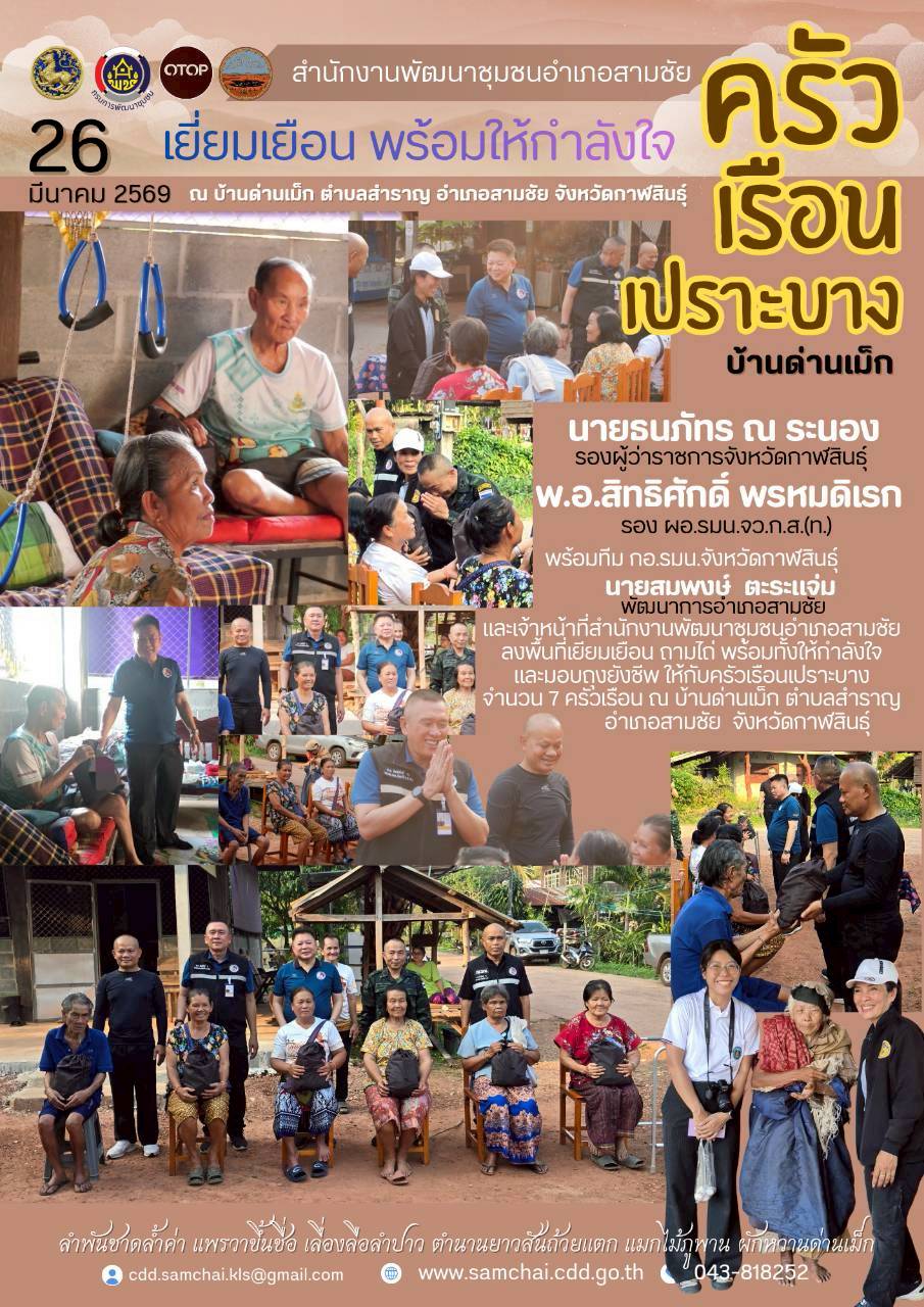 วันที่ 26 มีนาคม 2569 นายธนภัทร ณ ระนอง รองผู้ว่าราชการจังหวัดกาฬสินธุ์ พ.อ.สิทธิศักดิ์ พรหมดิเรก รองผู้อำนวยการรักษาความมั่นคงภายในจังหวัดกาฬสินธุ์ พร้อมเจ้าหน้าที่ กอ.รมน.จังหวัดกาฬสินธุ์ นายสมพงษ์ ตะระแจ่ม พัฒนาการอำเภอสามชัย และเจ้าหน้าที่สำนักงานพัฒนาชุมชนอำเภอสามชัย ลงพื้นที่เยี่ยมเยือน ถามไถ่ พร้อมทั้งให้กำลังใจ และมอบถุงยังชีพ ให้กับครัวเรือนเปราะบาง จำนวน 7 ครัวเรือน ณ บ้านดานเม็ก หมู่ที่ 12 ตำบลสำราญ อำเภอสามชัย จังหวัดกาฬสินธุ์