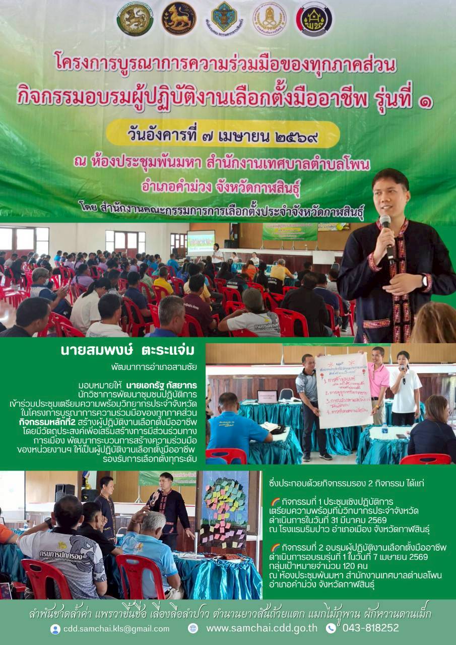วันที่ 7 เมษายน 2569 นายสมพงษ์ ตะระแจ่ม พัฒนาการอำเภอสามชัย มอบหมายให้ นายเอกรัฐ กัสยากร นักวิชาการพัฒนาชุมชนปฏิบัติการ เข้าร่วมเป็นวิทยากรประจำจังหวัดในโครงการบูรณาการความร่วมมือของทุกภาคส่วนกิจกรรมที่ 2 สร้างผู้ปฏิบัติงานเลือกตั้งมืออาชีพ เพื่อเสริมสร้างการมีส่วนร่วมทางการเมือง พัฒนากระบวนการสร้างความร่วมมือของหน่วยงานในพื้นที่ ให้เป้นผู้ปฏิบัติงานเลือกตั้งมืออาชีพรองรับการเลือกตั้งทุกระดับ ณ ห้องประชุมพันมหา สำนักงานเทศบาลตำบลโพน อำเภอคำม่วง จังหวัดกาฬสินธุ์